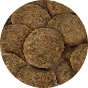 乾燥チキン、とうもろこし、米、玄米、ソイビーンミール、鶏脂(オメガ6脂肪酸・オメガ3脂肪酸源)、ビートパルプ、チキンエキス、乾燥卵、キャノーラ油(オメガ6脂肪酸・オメガ3脂肪酸源)、乾燥ミルクプロテイン、ビール酵母、クランベリー、フラクトオリゴ糖、グルコサミン、コンドロイチン、コエンザイムQ10