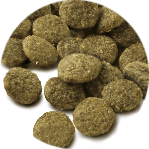 エン麦、大麦、ひよこ豆、乾燥ホワイトフィッシュ、ビートパルプ、サツマイモ、タピオカ澱粉、ビール酵母、はと麦、植物油、亜麻仁(オメガ6脂肪酸・オメガ3脂肪酸源)、セルロース、酵母エキス、フィッシュパウダー、スピルリナ、ひまわり油(オメガ6脂肪酸源)、フィッシュオイル(オメガ6脂肪酸・オメガ3脂肪酸源)、オリゴ糖、パン酵母(セレン